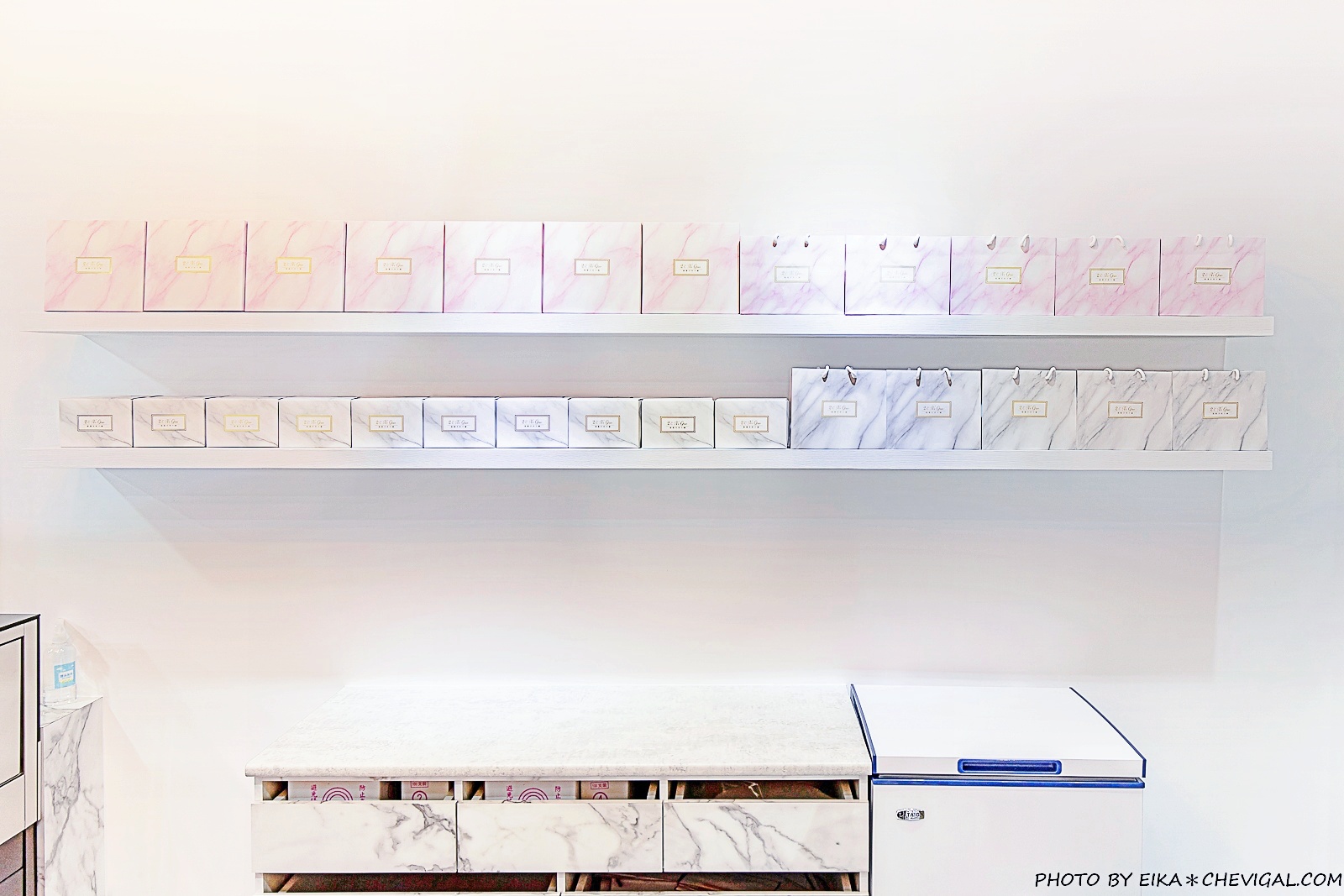店內的裝潢簡潔大方,可以看到櫃檯與牆上的包裝盒都是大理石紋設計,不僅擁有優雅的質感,也很符合千層蛋糕甜甜的少女形象。