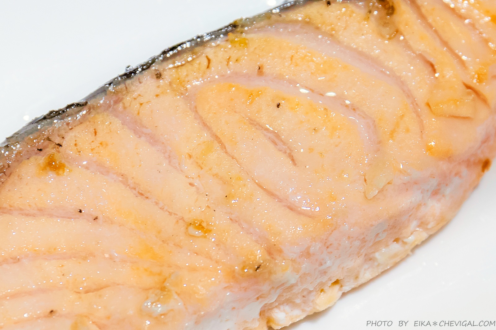 想要吃到好吃的鮭魚燒,在烤功方面真的得有些技巧,尤其這裡是帶皮的鮭魚,所以這裡當然就請小鮮肉店員為我們服務啦!烤好的鮭魚油脂豐滿,完全沒有奇怪的魚油腥味,肉質更是香嫩不柴澀。