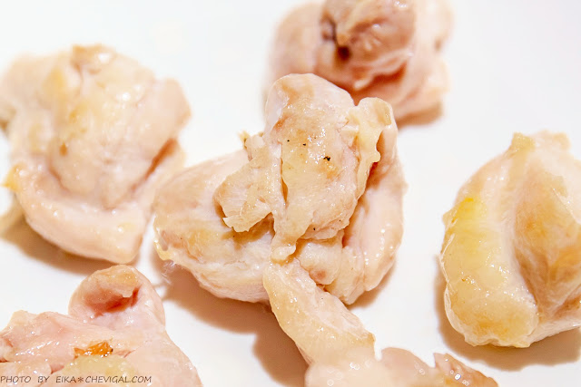 部份雞腿肉雖然有帶雞皮,但是油脂都有修清,吃起來完全不會有讓人怕怕的感覺。鮮嫩又帶有嚼勁的肉質不顯柴澀,還能感受到肉汁微微的甜味。