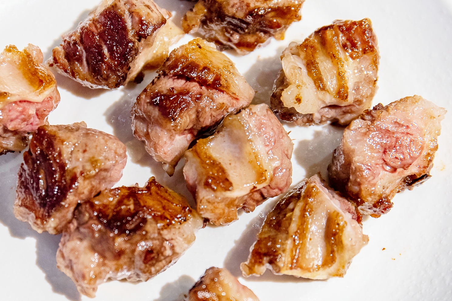 美國牛肋條可以烤至金黃微焦的程度,肉質富有彈性與嚼勁,同時還能吃到酥脆的口感,油脂的焦香更是迷人。