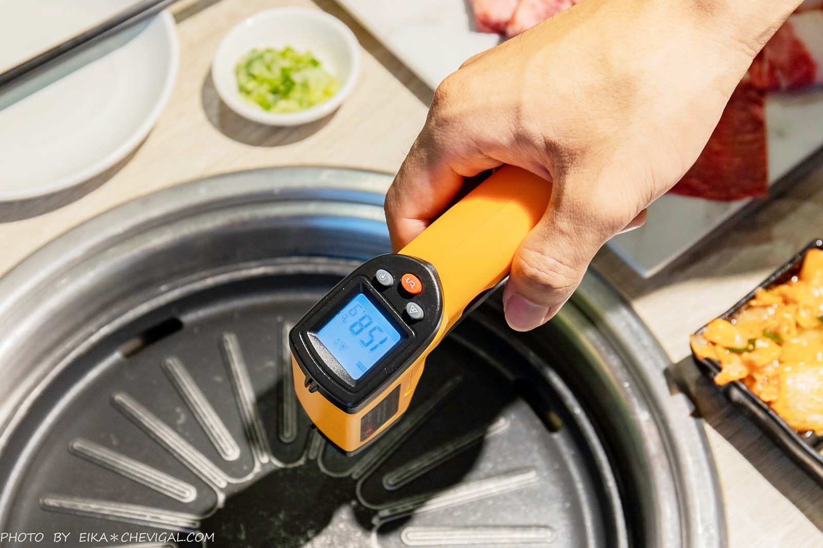 「輕燒肉」這件事真的不只是一個口號,服務人員在每次烤肉前都會測量烤盤的溫度,將溫度控制在155度上下,控溫燒烤的方式,不僅能讓你們能夠吃到食材鮮甜原味,同時又能降低油煙的產生。