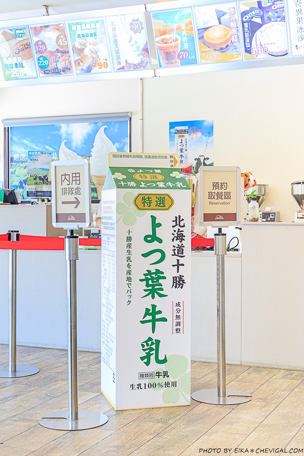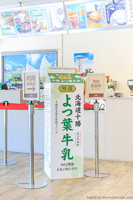 走進店內就能看到內用排隊與預約取餐的指示牌,同時還能看到北海道十勝四葉牛乳的放大版模型;原來店內所有需要使用到牛乳的品項,全部都是選用這款新鮮直送的牛乳!
