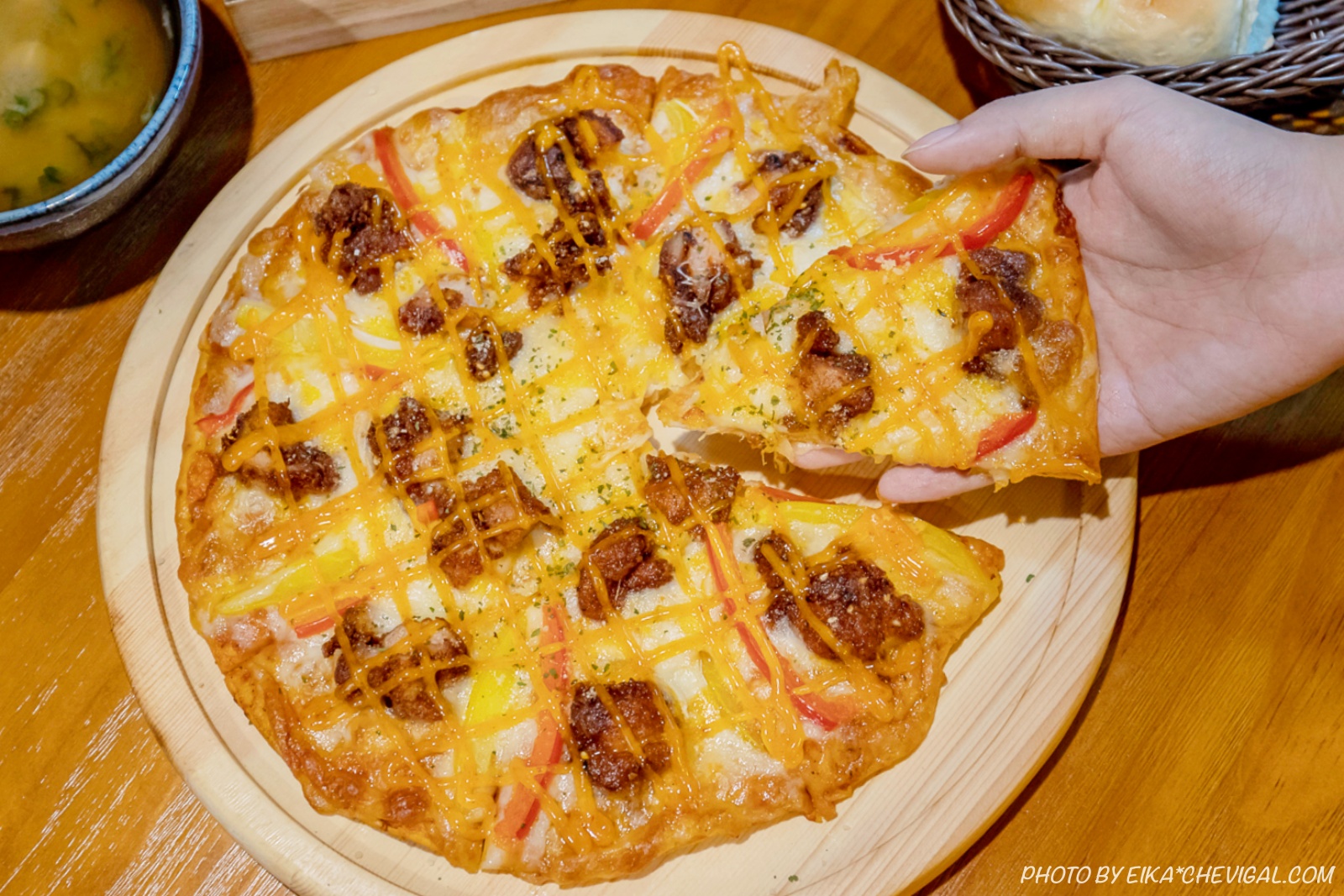 十吋的薄片披薩烤得香酥脆口,表面鋪滿了清脆的彩椒、以及帶有辛香的洋蔥,再搭配上外酥內軟的唐揚雞,口感層次非常豐富!