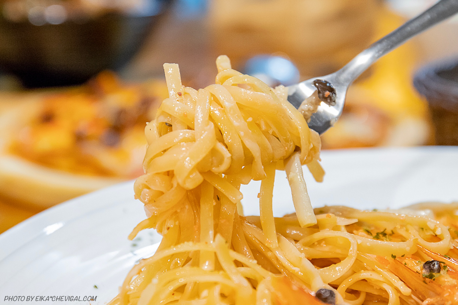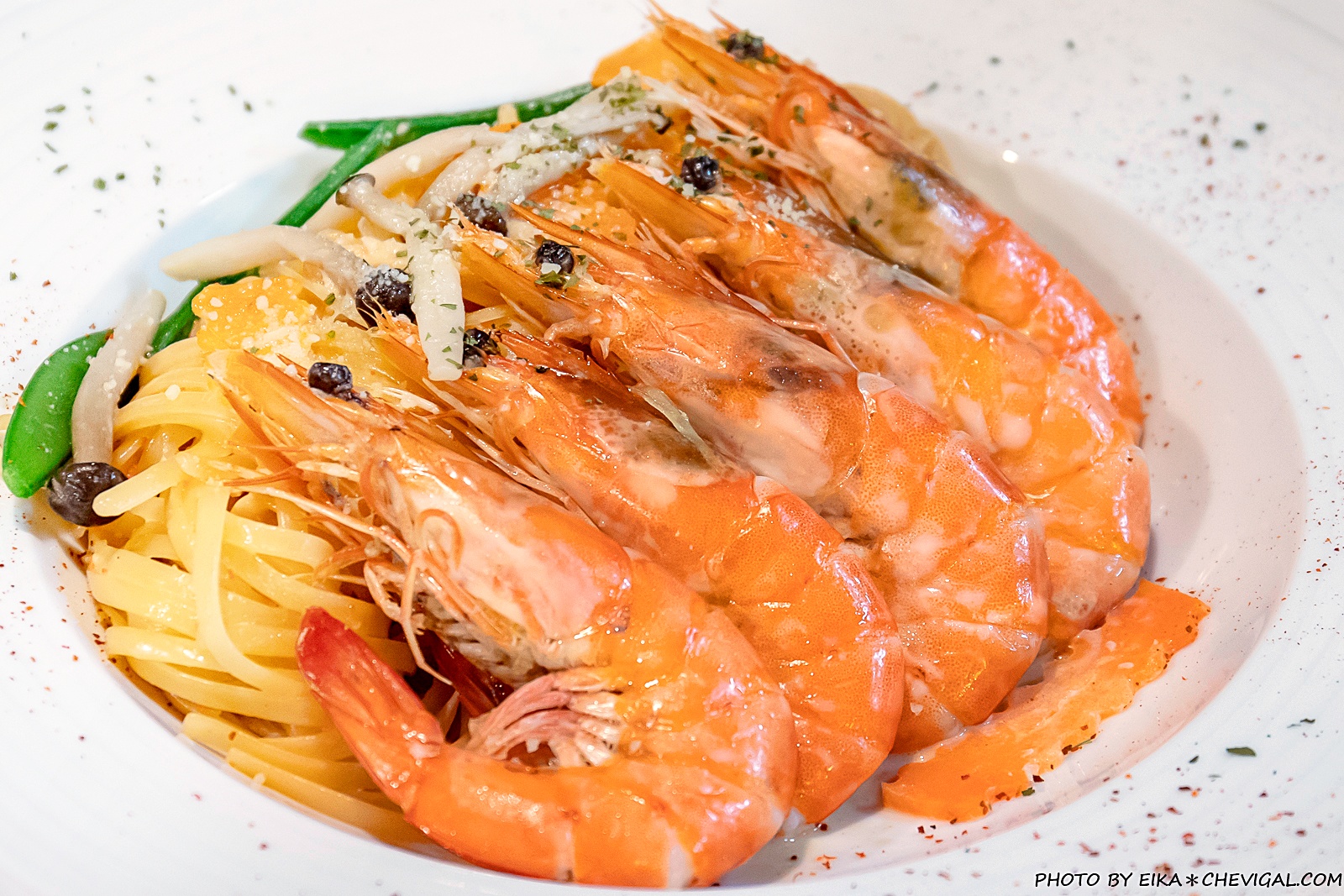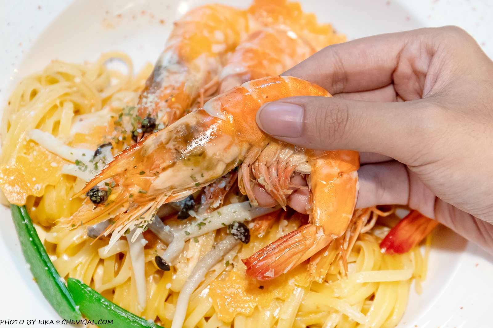 奶油明太子鮮蝦義大利麵一送上桌,馬上讓我們驚呼連連,因為鮮蝦一字排開,直接佔據超過整整半個盤面!海鮮控都忍不住要蠢蠢欲動了~