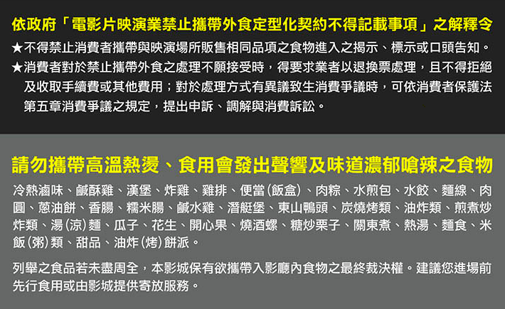 官網有列舉出管制的外食品項,以上提供給你們參考,我們自己會比較建議來看電影前後到夜市飽餐一頓會比較保險,如果實在不得已,影城也有提供寄放服務。