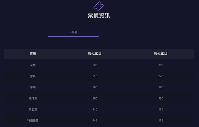 台中國賓影城的最新價目表一併附上給你們,2D版電影票價為全票290元 / 優待票260元 / 會員票210元,3D版電影票價為全票350元 / 優待票320元 / 會員票270元。