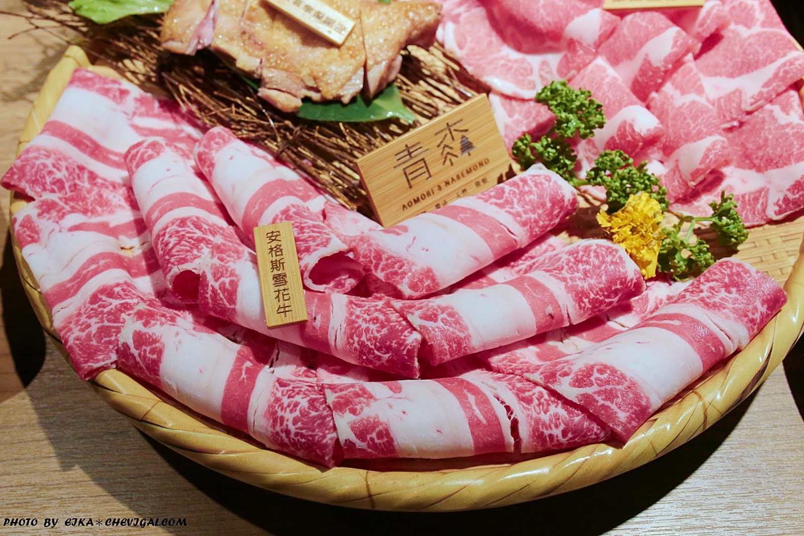 其他肉品則以大盤盛裝著,分別有香豚豬梅花、安格斯雪花牛與鮮嫩無骨雞腿肉。