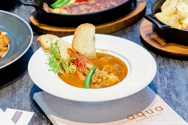 這道法式馬賽蝦汁海鮮清湯,可以說是水相的人氣湯品,豐盛的程度讓我們一開始還以為是主菜呢!整碗裡面有兩片法國麵包切片、根島蝦、蛤蜊、花枝、帆立貝,不論是賣相或用料都頗有誠意。