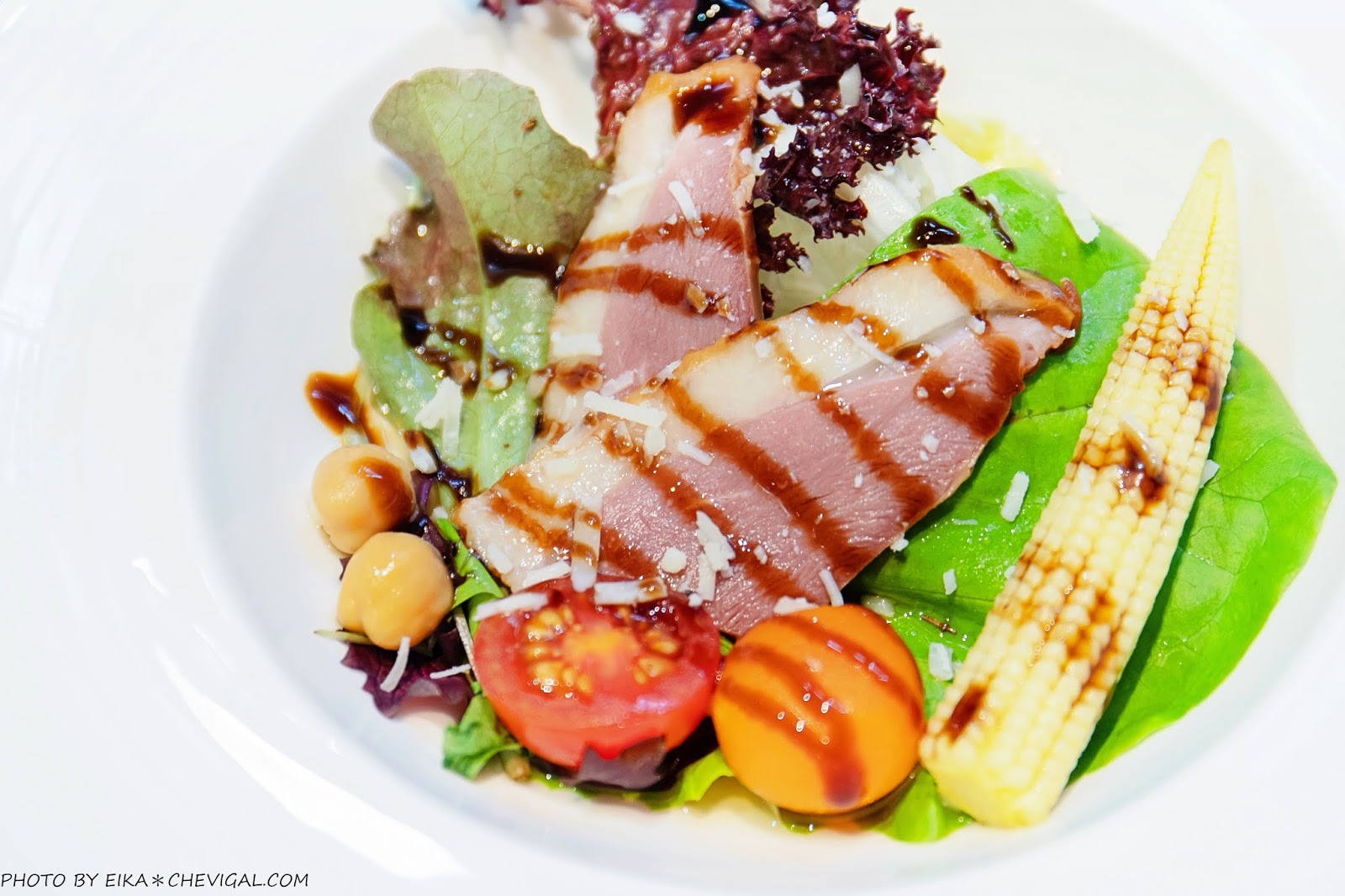除了招牌火山起司麵包之外,附餐還有供應鴨胸沙拉,油醋醬的風味清爽可口。