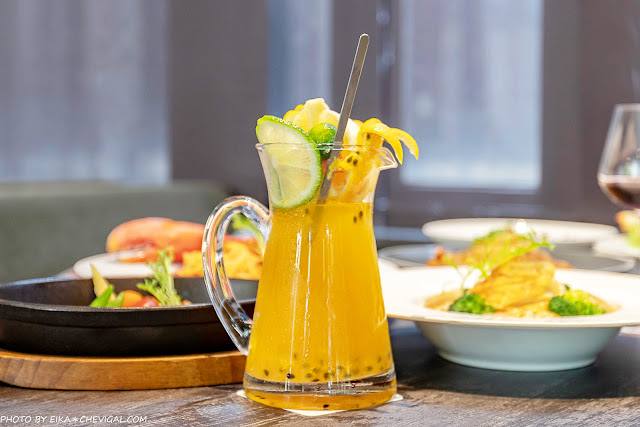 義式料理附餐除了含有前面介紹的麵包、沙拉與湯品,另外還有附贈飲品,這天我們的飲品都有另外再加價升等;像這杯招牌新鮮水果茶可以說是水相人氣必點的品項,喝起來有著鳳梨、柳橙與百香果的酸甜,表面還有檸檬、金桔與柳橙等多種水果點綴,用料真的大方不手軟!