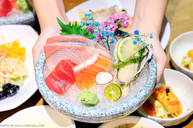 南非生蠔盛合刺身,來到水森水產務必要來試試他們家的生魚片,身為生魚片控的魚編特別喜歡鮭魚,豐厚油脂又幾近入口即化,讓人相當著迷!套餐刺身裡面另外還搭配了紅魽與海鱺,一次就能吃到多款魚種。
