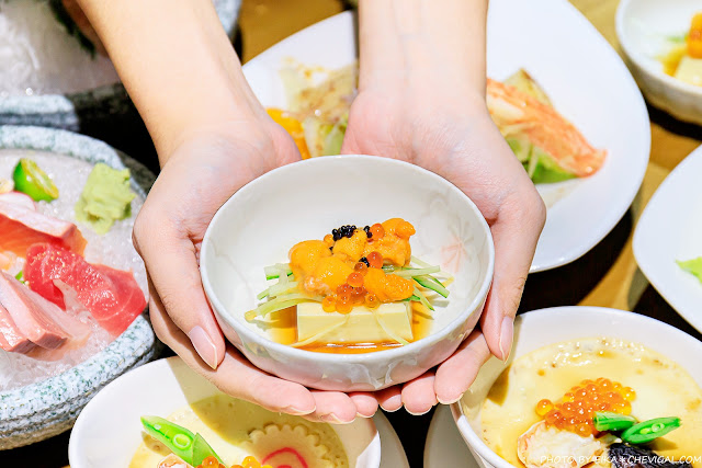 三和聚鼎套餐是雙人套餐的設定,因此會提供兩份手作前菜,目前只要於google給予水森水產評價,就可以直接升級為海膽豆腐!而且表面的海膽真的給的大方不手軟,搭配底下細緻滑嫩的豆腐,特別開胃~