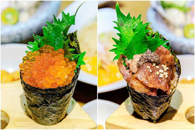 手卷的部份有鮭魚卵手卷與炙和牛手卷兩種可以選擇,其中炙和牛手卷特別適合不敢吃鮭魚卵朋友,和牛經過炙燒後散發出鹹甜的迷人香氣,吃起來格外涮嘴,我們自己私心比較偏好炙和牛手卷果然不是沒有原因的啊XD