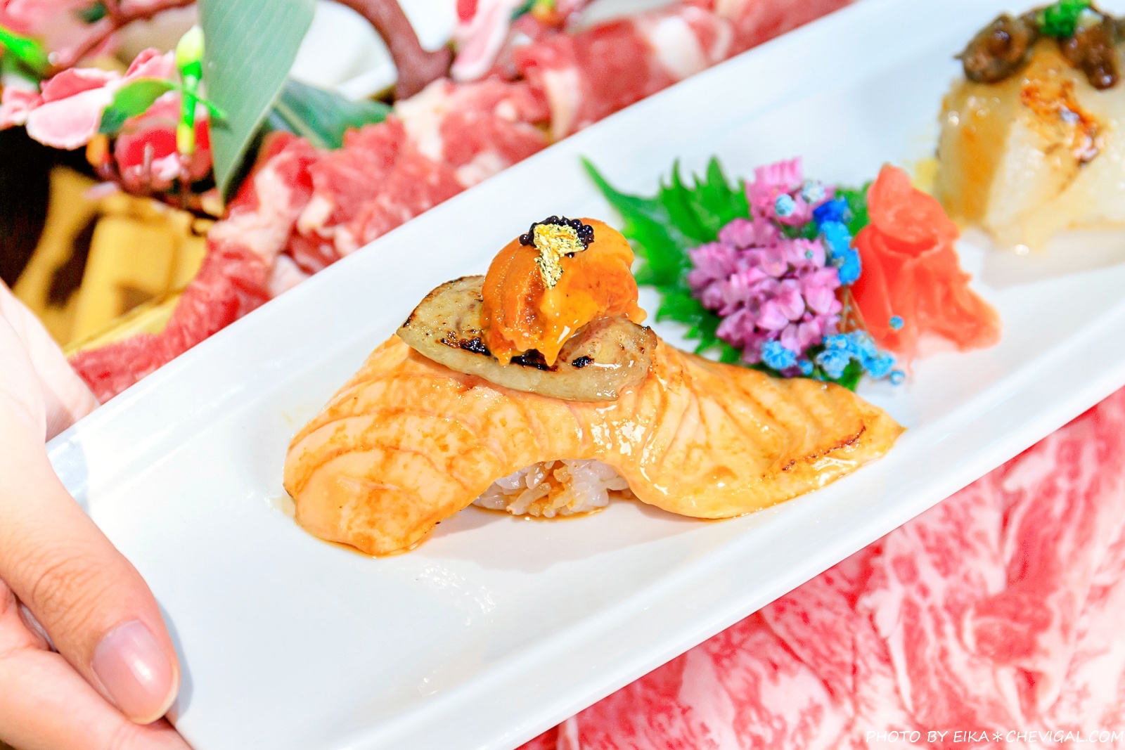 炙燒鮭魚海膽鵝肝握,這款應該是我們吃過最奢侈的握壽司啦!炙燒過的鮭魚表面不僅有著鮮美的海膽與鵝肝,甚至還有魚子醬與食用金箔點綴,入口非常有飽嘴感。