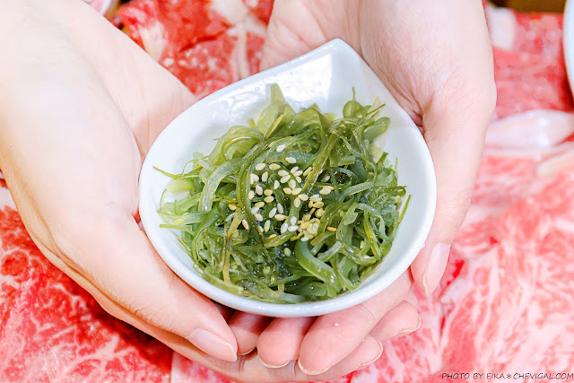 和牛不需完全煮熟,看到肉質呈現淡淡的粉紅色即可起鍋,非常推薦你們可以沾著隨盤附上的胡麻醬一起享用,堅果的香氣意外地更能襯托出和牛的鮮甜,風味也更加爽口,真的會讓人忍不住一片接一片XD
