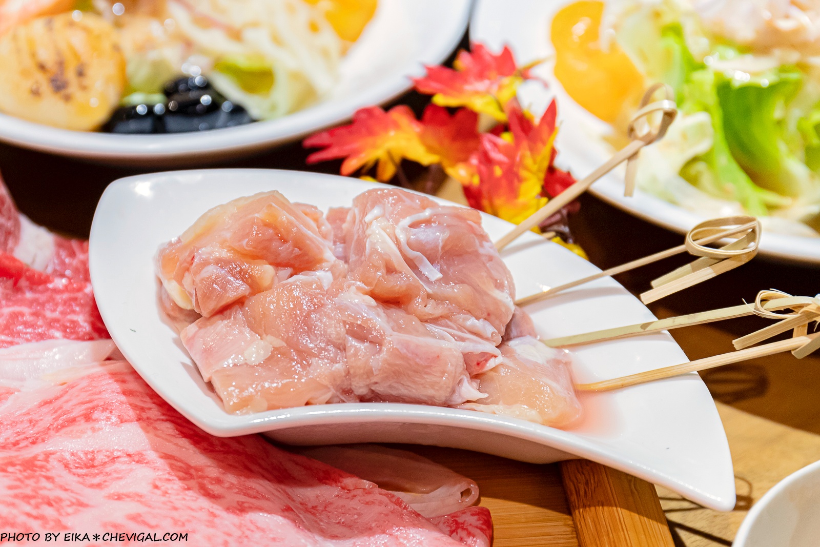 整份肉品除了三款和牛之外,另外還有提供一份雞腿肉,每塊都已經貼心地分切為適口的大小,吃起來鮮嫩不柴澀,而且整份的份量給得還不少。