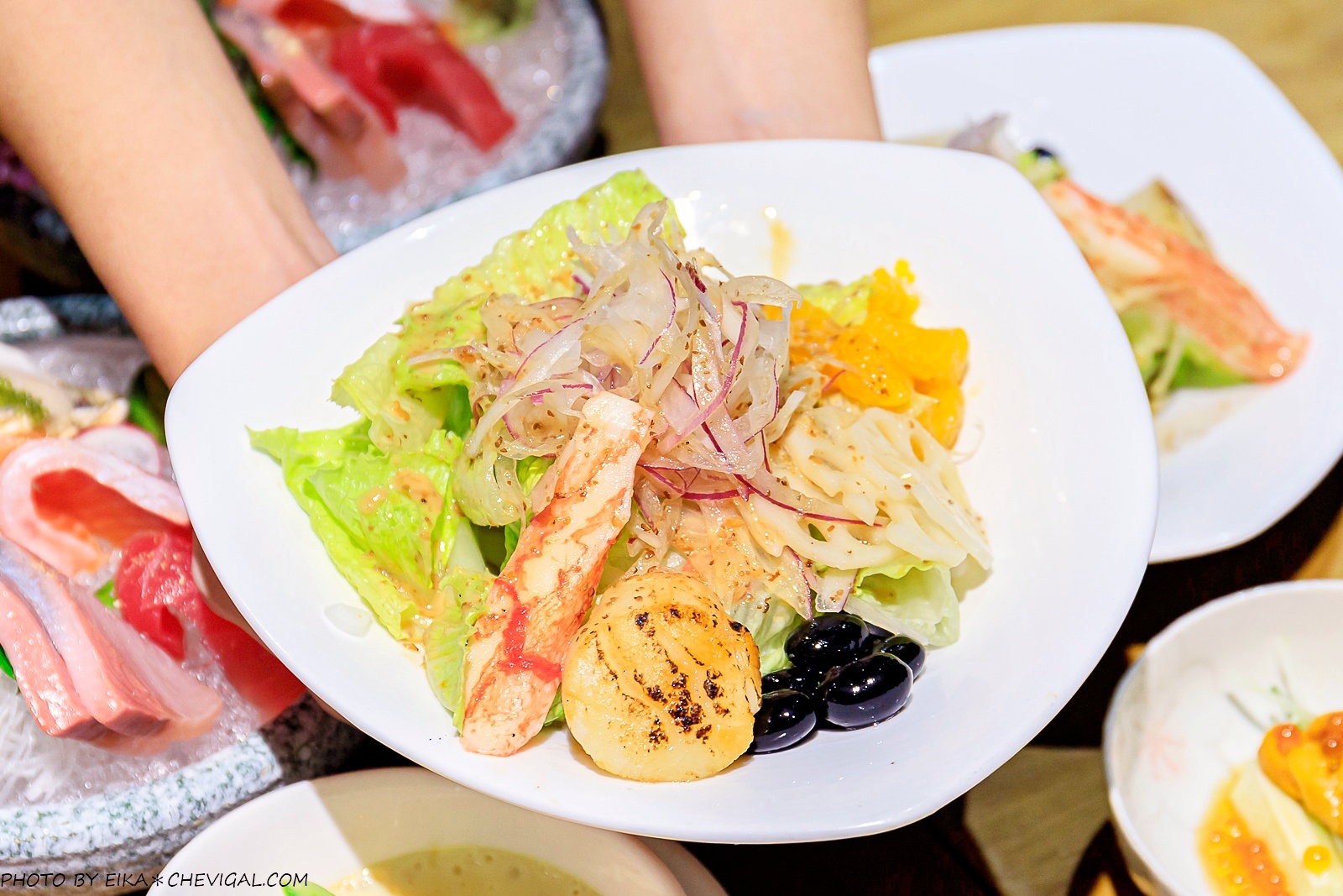 干貝沙拉不僅份量澎派,調味也是相當清爽開胃!各式生菜與蓮藕切片爽脆清甜,同時還能吃得到水果的沁甜微酸,以及黑豆的綿密口感;除了蟹肉棒之外,還能吃得到大顆的干貝,表面經過微微的炙燒,香氣迷人又不失鮮甜多汁。