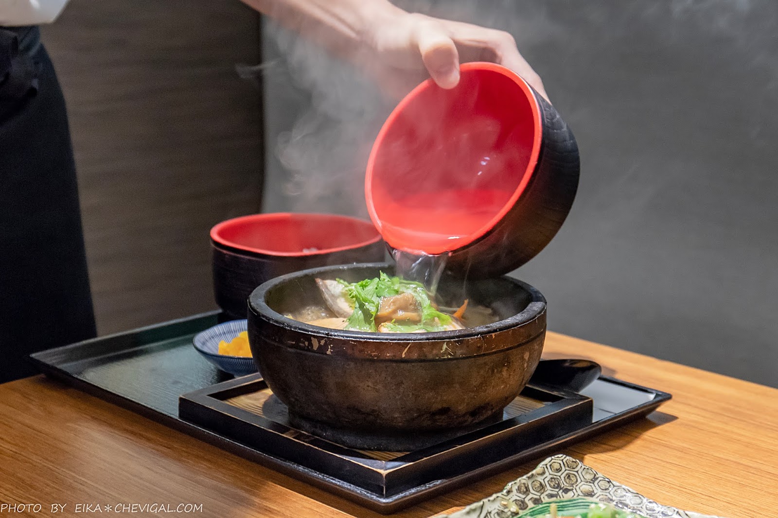 味噌奶油鮭魚石燒鍋$290元,這款是新上市的人氣新品,主要是利用石頭鍋的高溫,並由服務人員當場倒入特製高湯,縮短烹煮的時間,一上桌沒多久就能吃到暖呼呼的鍋物了!