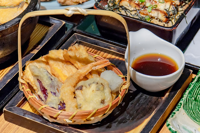 炸蝦天婦羅$120元,來吃日式料理當然少不了天婦羅!以小竹籃盛裝著各式金黃酥脆的天婦羅,裡面還貼心地附有蘿蔔泥,可以依自己的口味加入天婦羅醬當中。