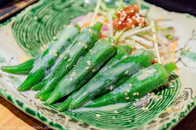 豆味噌冷芝麻秋葵$98元,這道也是今年推出的新菜色!雖然秋葵是比較看人吃的蔬菜,不過我們剛好就是特別偏愛清甜之中帶點稠度的特殊口感。