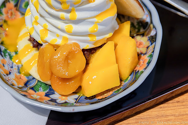 除了大塊的新鮮芒果與杏桃之外,柔軟綿密的霜淇淋底部還有滿滿的紅豆泥;結合了日式傳統銅鑼燒微甜軟綿的特色,搭配水果更是富有新意,甜度也不會太甜,少女心根本止不住啊!