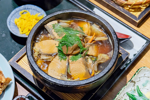 蒲燒鰻魚柳川重內附湯品、主廚煮物與茶房漬物,湯品裡面的海帶芽將近有半碗,份量很實在,而且鹹度還蠻剛好的。
