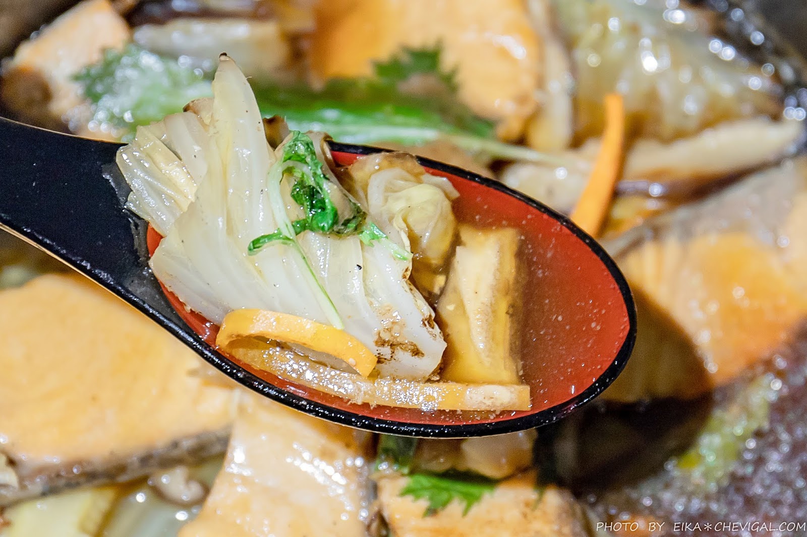 表面鋪滿了滿滿的鮭魚切片,給得份量頗有誠意,整尾現切的鮭魚果然相當新鮮,烹煮的熟度也不會太生或過熟!不過石頭鍋的溫度真的很高,要記得小心不要燙傷了。
