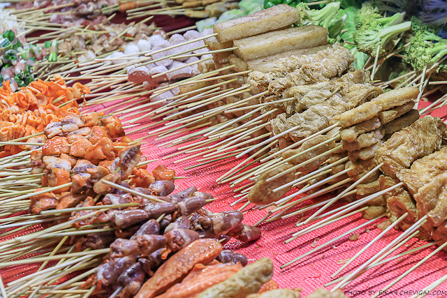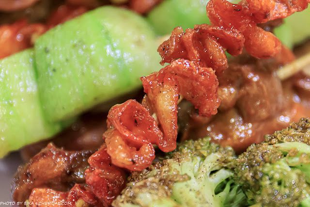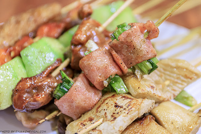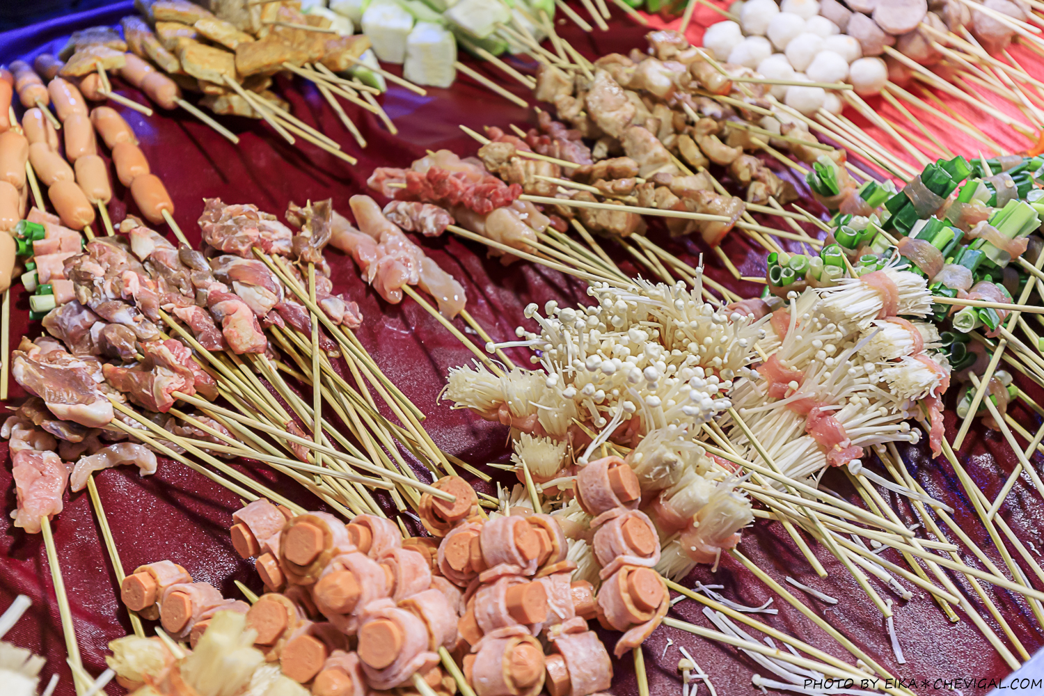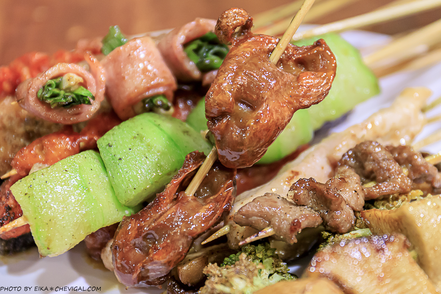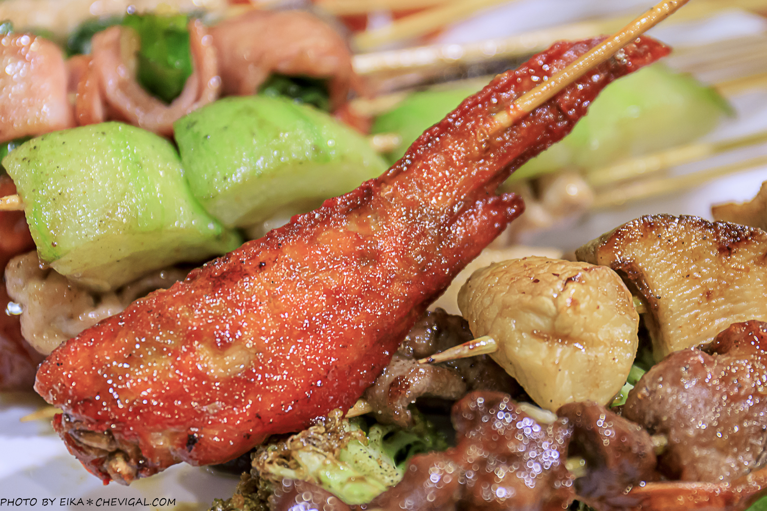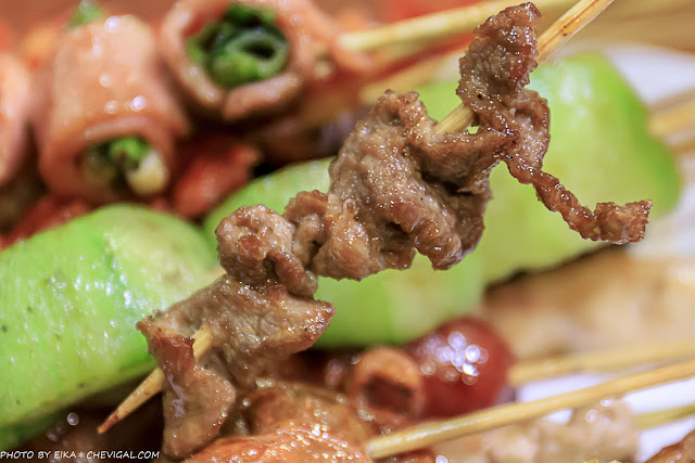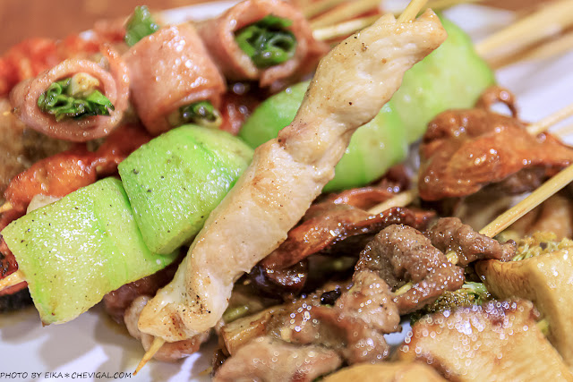 李林烤肉之家的品項選擇相當豐富,蔬菜、蕈菇類與牛、羊、豬、雞肉串,另外還有培根捲、蔥肉捲、豆腐、雞皮、蘿蔔糕……等食材,架上看到的每串均一價14元,真的非常佛心,一個不小心就會默默夾了一大盤XD