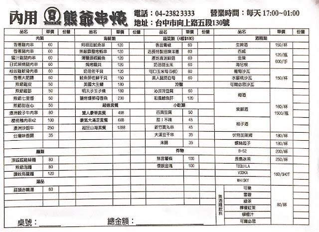 熊爺串燒的種類算是還蠻豐富的,有分肉類、海鮮類、蔬菜類等大項,另外還有冷盤、炸物、小吃、麵類與湯品;來吃串燒當然也少不了多款啤酒與調酒,不能喝酒的朋友也有無酒精飲料可以選擇。
