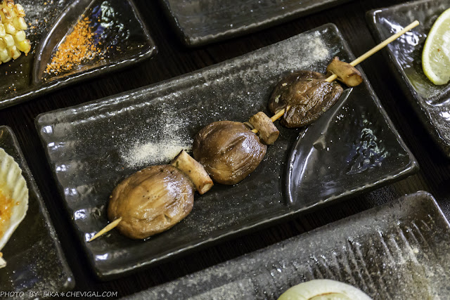 產地直送鮮菇($60元),鮮菇的傘面外觀水亮飽滿,另外還將富有嚼勁的傘柄交互串在一起,吃起來帶點鹹香,卻不會蓋過鮮菇本身的原味。