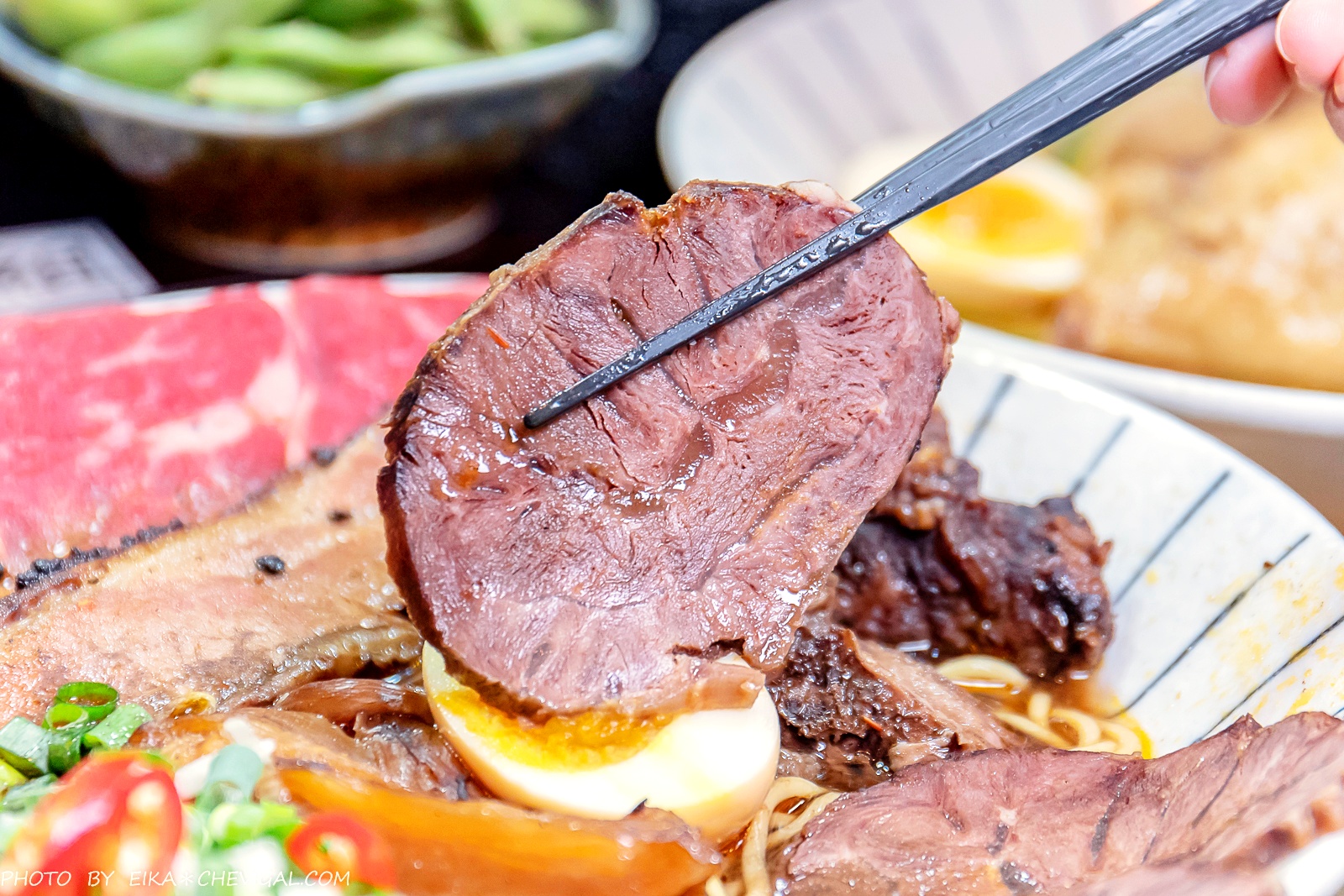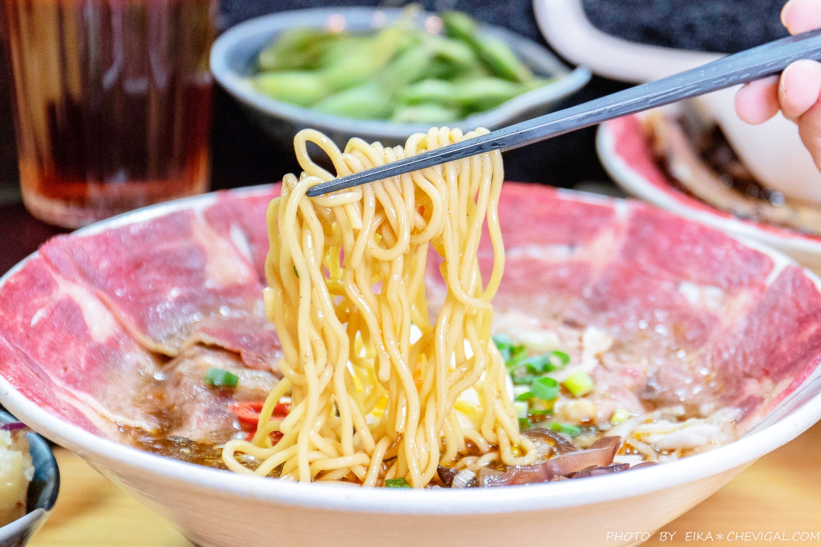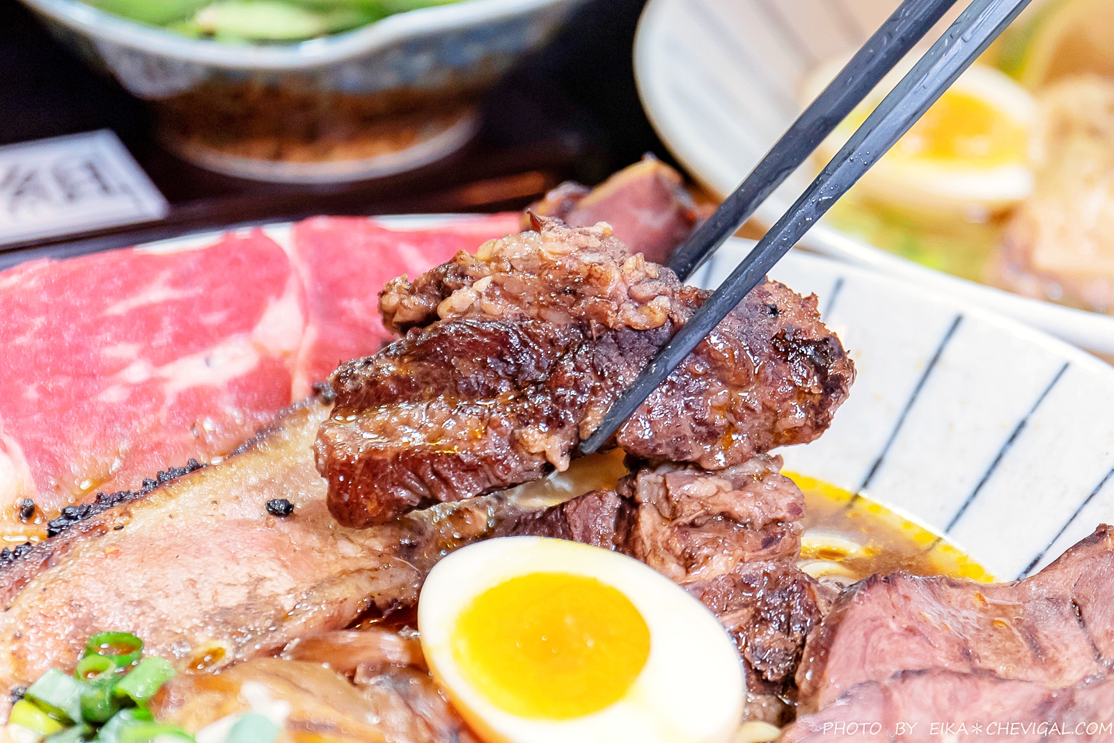 或許你們都很愛吃牛肉麵,但除了比較台式吃法的鮮涮牛肉麵之外,應該很難得吃到這種擁有半熟牛肉的日式拉麵!新撰組選用了choice等級的翼板牛肉,上桌時還能看到粉嫩的肉質色澤。