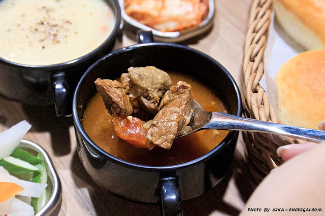 每日供應的湯品皆有不同的變化與調整,像這天的清湯是羅宋湯,加入大量番茄與洋蔥長時間燉煮,每勺撈起來都是滿滿紮實的牛肉塊,不說還不知道這竟然也是喝到飽,非常有誠意!