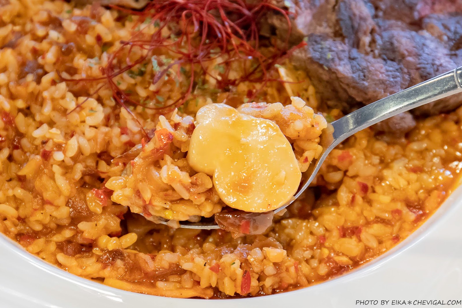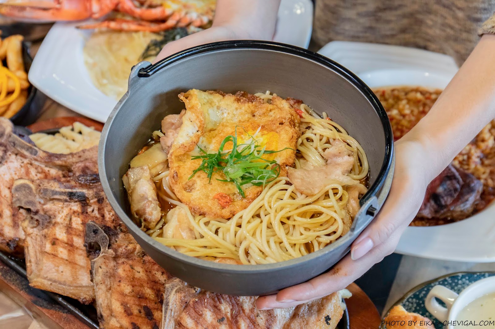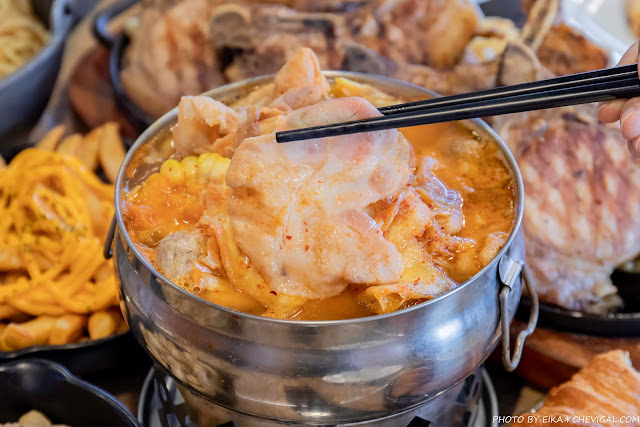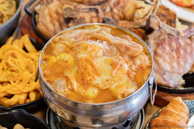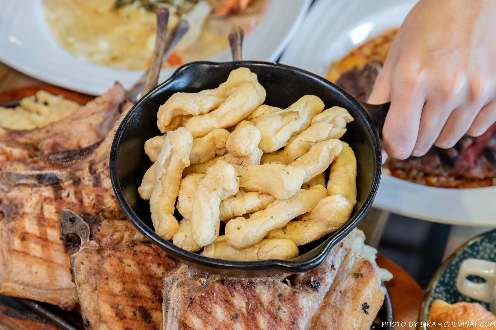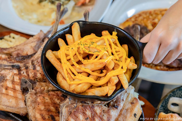 餐點上桌時的氣勢果然很霸氣!以鐵板盛裝著四大隻戰斧豬排,根本讓我們兩個人都快忍不住給它跪下啦~因為這完全是三至四人的份量,就算女生也不一定有辦法自己吃完一隻呢!