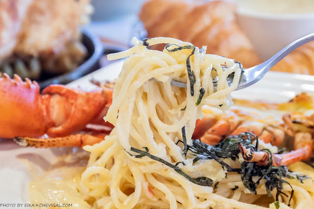如果愛吃白醬又愛焗烤的你們,肯定不要輕易錯過這盤也很霸氣的義大利麵~香濃的義大利麵表面躺著半隻波士頓龍蝦,幾乎佔據了半個盤面,吸睛度毫不遜色!
