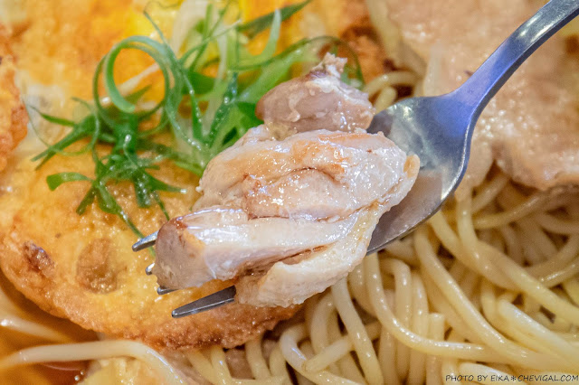 看到雞肉其實讓我們有些驚喜,原本以為雞湯麵只是單純的湯頭,結果竟然能夠吃到多塊紮實鮮嫩的雞肉,裡面還有另外附上一整顆炸蛋唷~