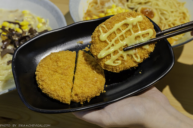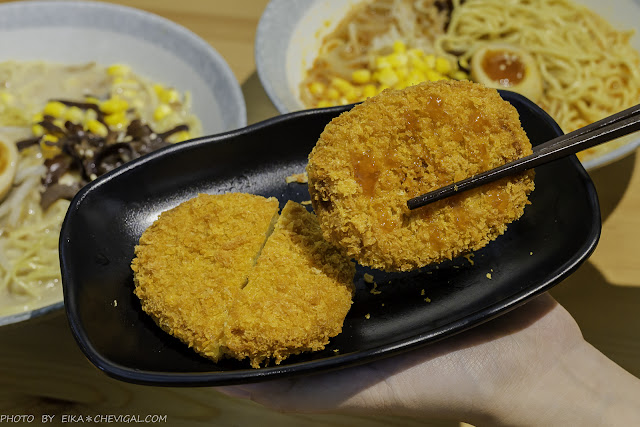 咖哩可樂餅拉麵(豚骨),以一般平價拉麵來說,晴食堂的拉麵份量真的算是蠻多的,魚編當天沒有再另外加湯加麵,卻好不容易才有辦法完食,甚至還差點和柚編求救,算是很符合學區學生偏好的大份量!