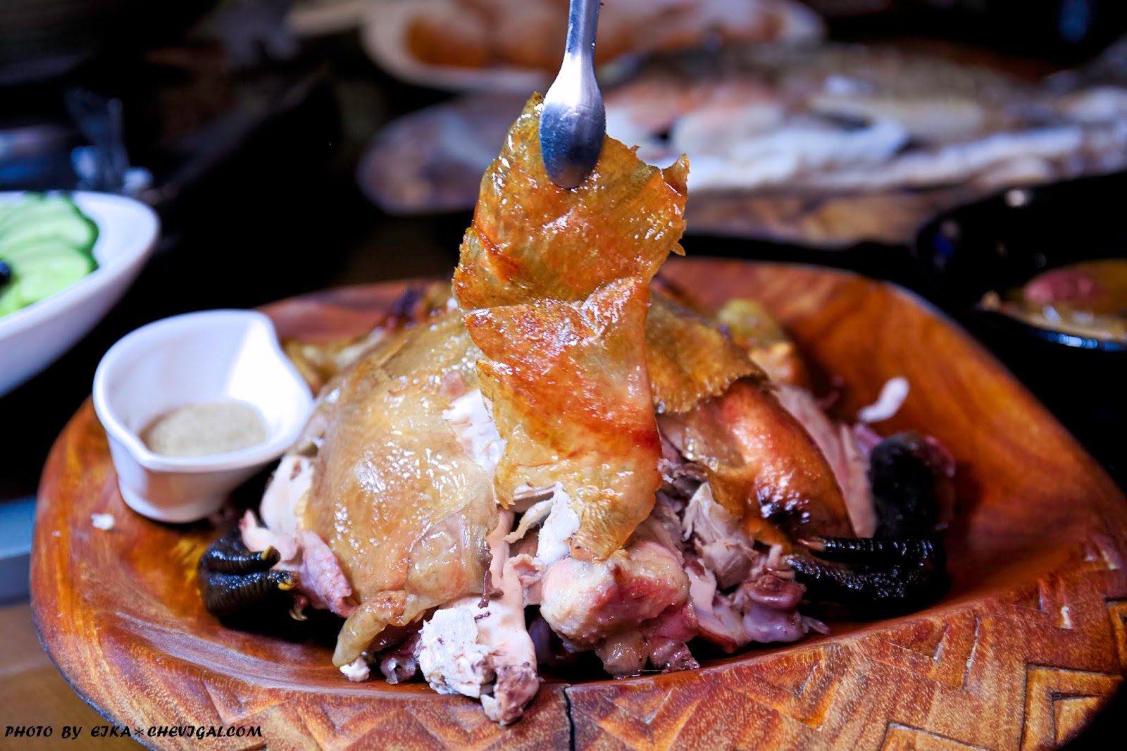 來吃原住民風味料理,當然不能錯過招牌桶烤雞啦!整隻金黃油亮的烤雞,一旁還有收集烤雞時滴下來的油湯,不論沾肉、配飯都很好吃!可惜烤雞的肉質烤得稍乾,如果還能保有軟嫩多汁的口感會更棒!