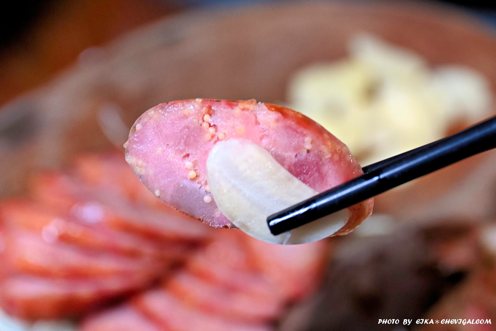 石板雙拼也是當天同桌友人都特別喜歡的菜色,以木質器皿盛裝飛魚卵香腸與鹹豬肉,特別有種原始道地的感覺。