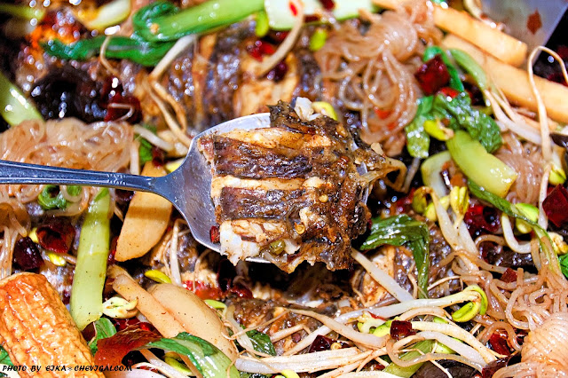 把表面滿滿的配菜全部撥開來,發現整隻魚肉幾乎鋪滿整個烤盤!原來店內都是兩斤重左右的魚隻,除了剛好能夠符合烤盤的大小,另外還貼心地將魚肉剖半,讓我們不用再費心幫魚肉翻身,也能讓肉質更加入味好夾。