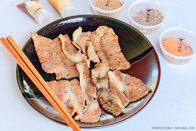 霜降松阪豬燒肉片吃起來略帶點脆彈,油脂的比例雖然豐富,不過整體還蠻爽口的;如果擔心比較膩口的話,可以烤至有點金黃微焦的程度,吃起來特別過癮!