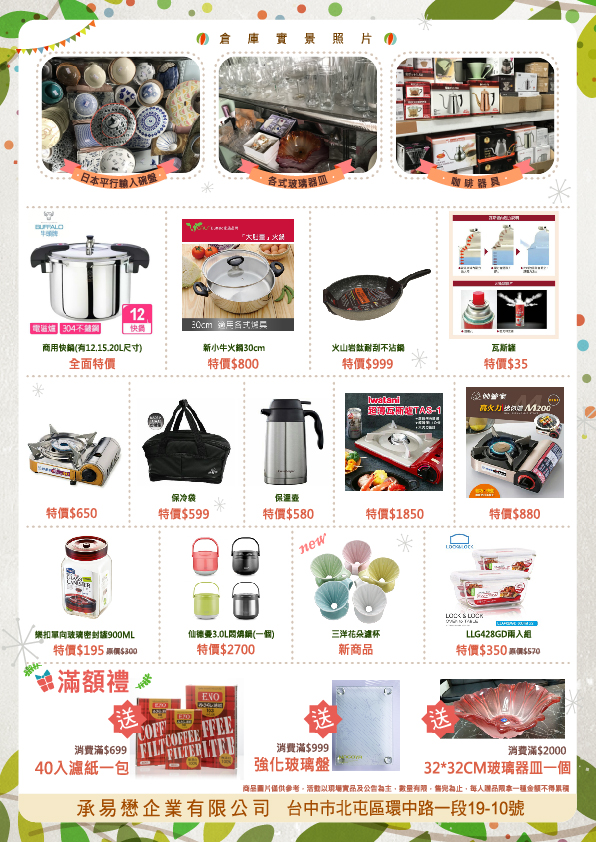 年終除了要開始準備打掃家裡,也是除舊換新的好時機!位於環中路一段的承易懋企業,平常專門經營餐具相關的批發,難得在年終舉辦特賣會開放給大家搶好康囉!