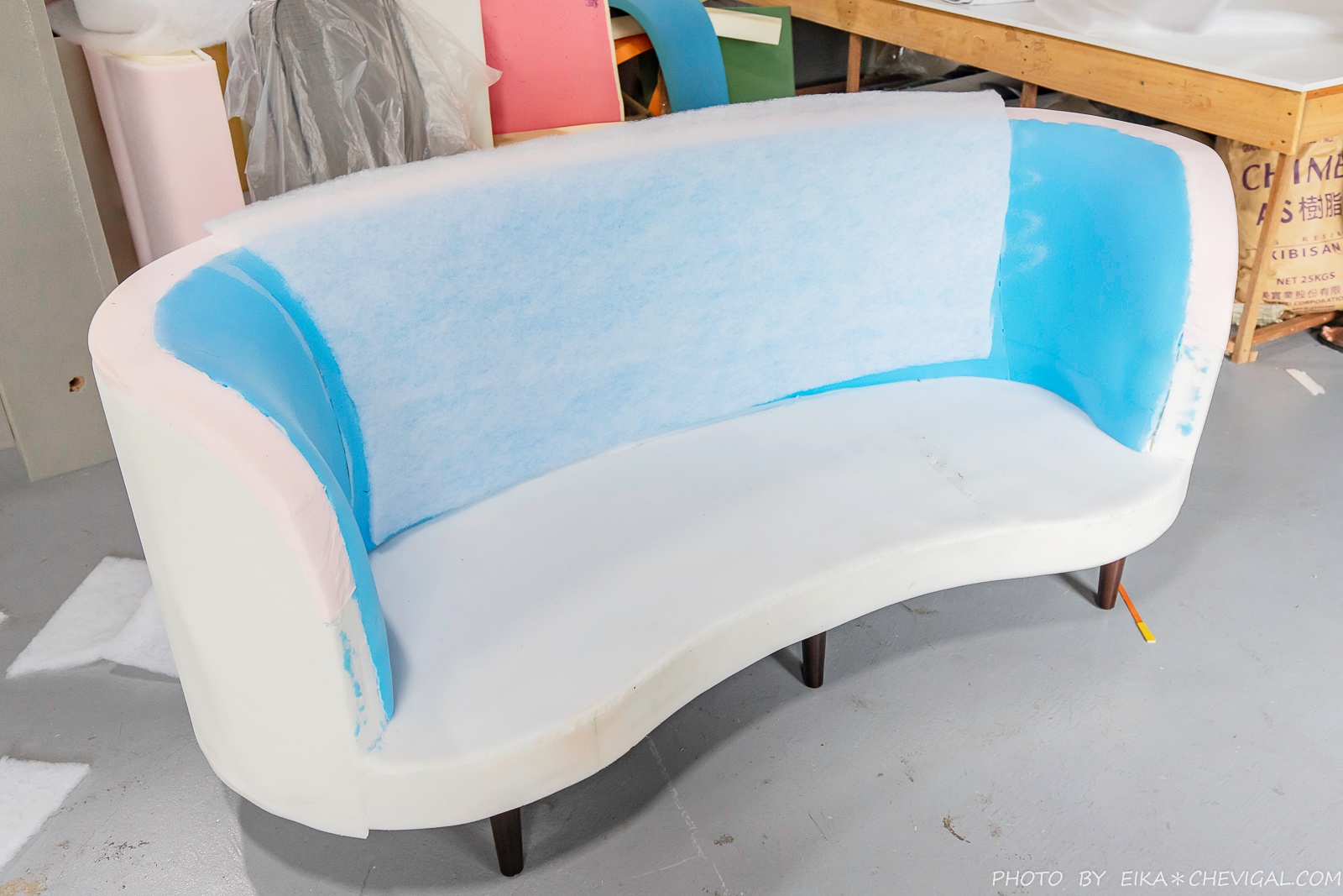 從最基本的材質選擇,以實木或合板固定沙發的骨架,並用不同係數的泡棉或乳膠,依照客戶的需求製作成形。