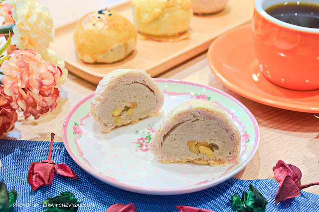 芋頭內餡比較細柔,香味也很自然,中間還包入了松子,增加了整體的口感與香氣的層次,還蠻特別的!