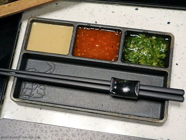 魚小編本身最愛的胡麻醬,適合搭配牛肉或豬肉;店家推荐的炭燒醬適合搭配牛肉,蔥油醬則會建議搭配豬肉與雞肉。火鍋店少見的炭燒醬吃來還蠻涮嘴的,蔥油醬香氣很足,不過口味會稍鹹一些。