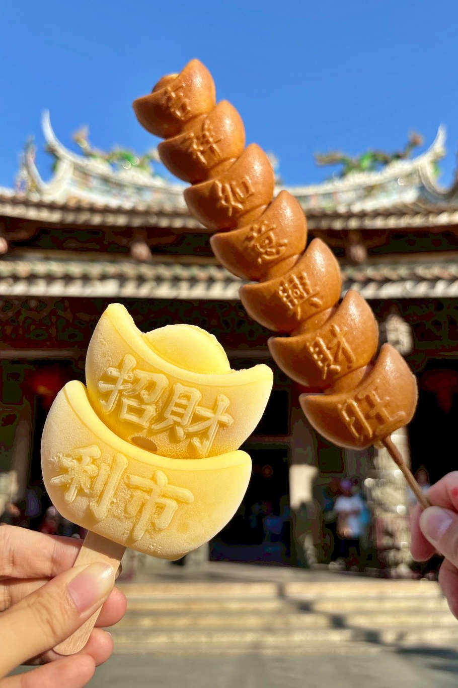 旁邊還有一間獨特的「元寶雞蛋糕」,雞蛋糕的蛋香超迷人,甚至還有販售元寶造型的冰棒,好吃又非常討喜呢!