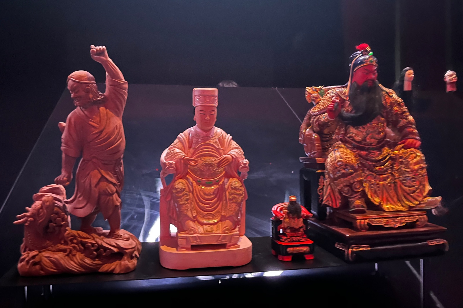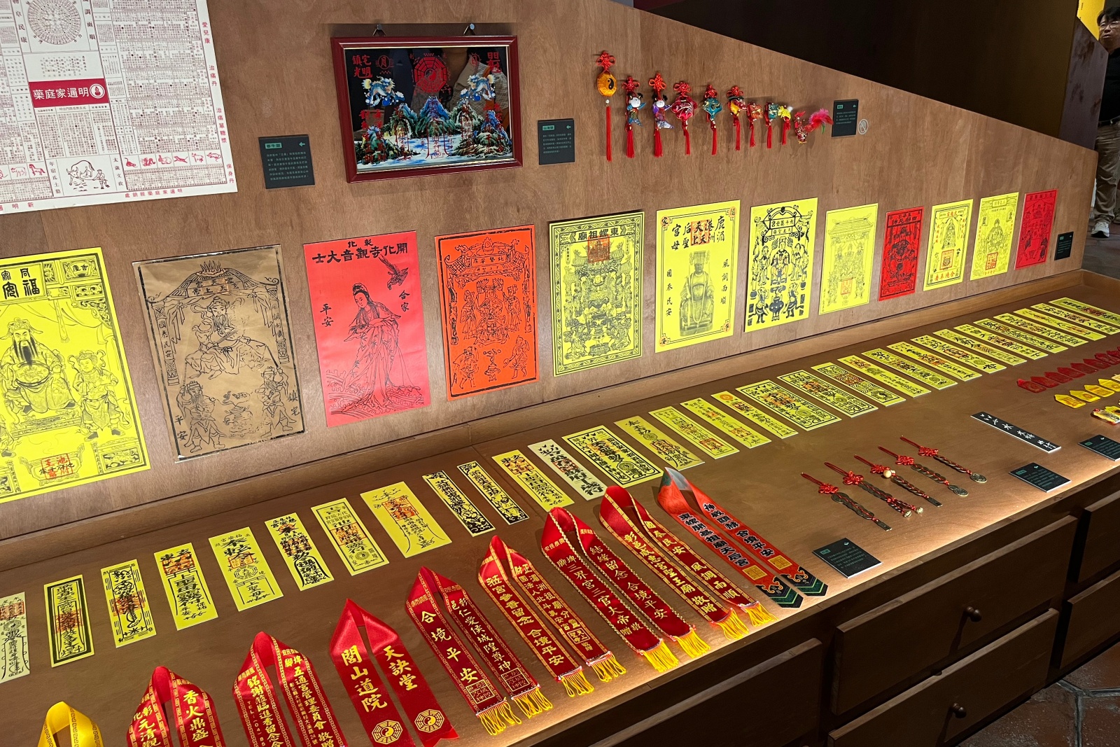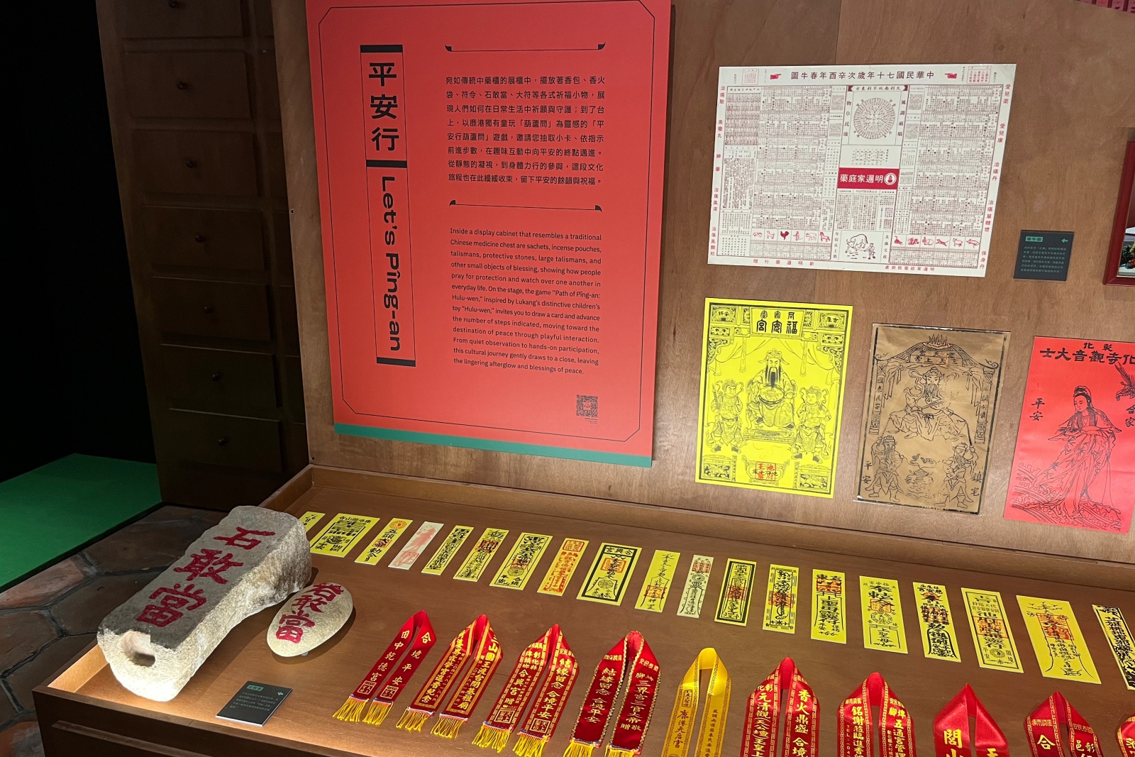 復刻舊式的傳統展櫃裡,更陳列了節慶與民俗活動中常見的平安物,像是香包、符咒、石敢當、大符、香火袋與山海鎮等,體現彰化節俗如何創造出平安心定的感受。