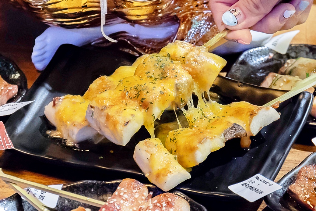 起司杏鮑菇串3串$150元,大塊的杏鮑菇吃來很有飽嘴感,Q彈且帶有清甜水分。重點是表面的起司給得很大方,趁熱的時候還會牽絲,香濃的奶香帶點鹹度,推薦起司控必點哦!
