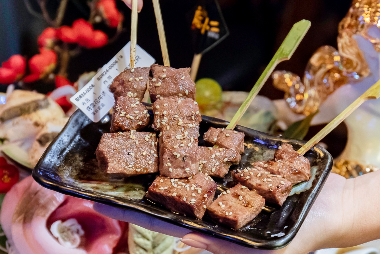 烤雪花牛肉串(東京醬燒)4只(2份)$300元,東京醬燒的風味鹹香略帶些自然的甜味,應該是蠻多人都會喜歡、熟悉的口味;另外還有葡萄牙酸辣醬、韓式辣醬與鹽巴胡椒口味可以嚐鮮看看。
