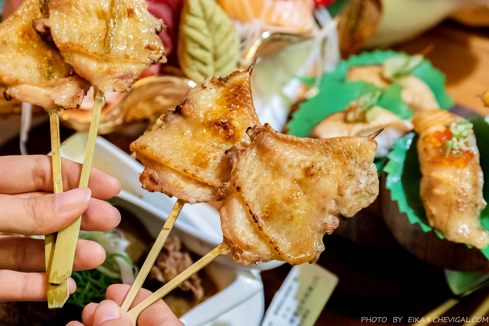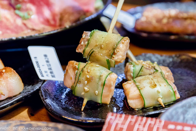 鮭魚黃瓜串$180元,以切成薄片的黃瓜包裹著鮭魚,表面有稍微炙燒過,可以吃得到黃瓜的清脆,以及鮭肉的Q彈與油脂香氣。