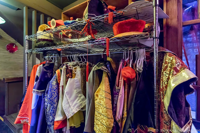 許多客人來到店小二,最喜歡體驗的就是經典古裝!像一樓的包廂內就有多種款式的官帽,與家人朋友搶當王爺、太監、貴妃與宮女都很有樂趣,而且二樓甚至還有多套衣服可以裝扮!